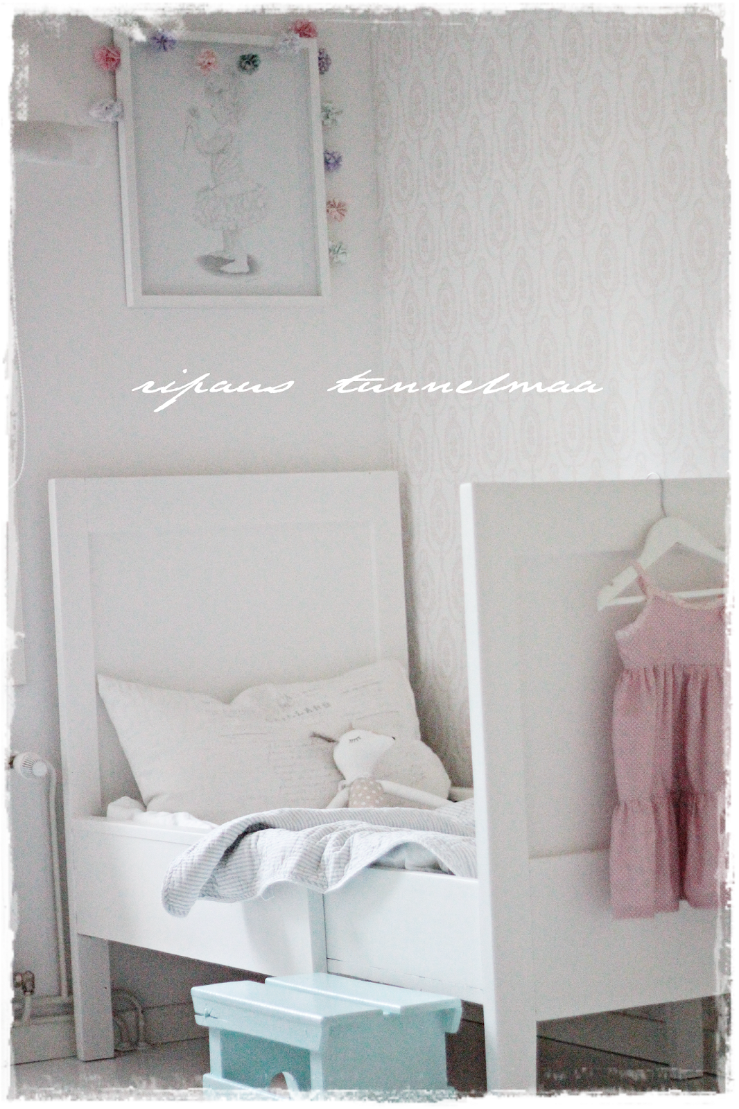 Jossain kohtaa revin tapetin kokonaan pois ja ostinkin tilalle Kodin terrasta, alelaarista, ihanaa roosa-valkoista tapettia. Tapettirullat saivat kuitenkin tovin odottaa sillä vasta uuden sängyn myötä iski pieni remppainspis ja eilen illalla mieheni kanssa saimme uudet tapetit seinään.