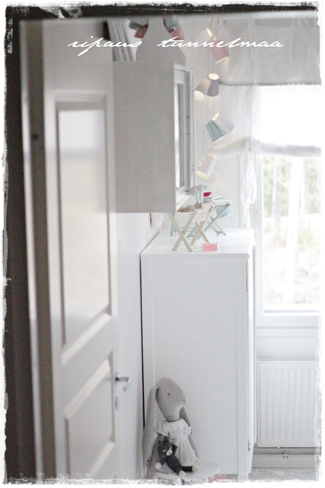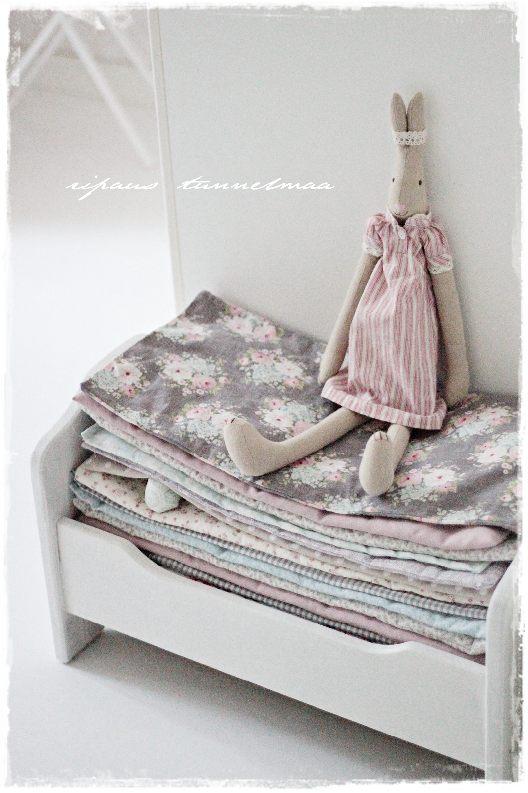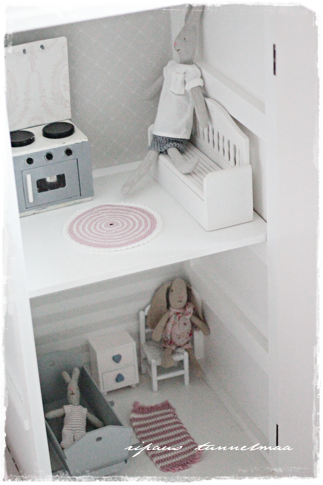 Seinä- ja sänkyrempan yhteydessä tuli karsittua tavaraa ja leikkineliöitä tuli hieman lisää. Vuosi sitten senkkiin rakentamani nukke/pupu/hiirikoti on saanut pikkuhiljaa lisää kalusteita. Muutamia Mailegin huonekaluja on tullut lahjaksi, rautasängyn väänsin rautalangasta ja loput ovat tuunattuja kirpparilöytöjä.